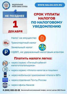 Уплатить имущественные налоги удобнее всего онлайн через портал госуслуг, а также через Личный кабинет налогоплательщика или сервис «Уплата налогов и пошлин» на сайте ФНС России. Срок уплаты – не позднее 01.12.
